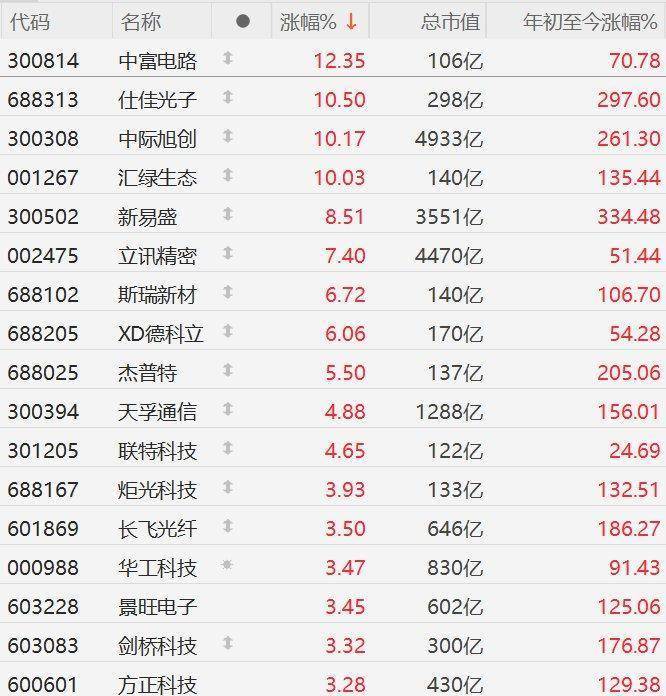 A股市场CPO概念股继续走强,截至半日收盘,中富电路涨超12%,仕佳光子、中际旭创涨超10%,汇绿生态10CM涨停,新易盛涨超8%,立讯精密涨超7%,斯瑞新材、德科立涨超6%,杰普特涨超5%。消息面上,兴证通信产业链调研显示,1.6T光模块需求持续上调。海外大客户近期上修2026年1.6T光模块采购计划,部分客户提前锁定明年产能,行业总需求预计从1000万上修到1500万,再到近期的2000万只,主要系GB300与后续Rubin平台加速部署,AI训练与推理网络带宽需求快速增长,1.6T产品进入量产放量。